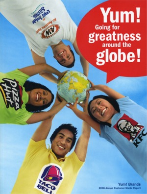 Download This Year's Entry Form Annual Report Highlights: View Competition Class Performance | Company Name: | Yum! Brands, Inc.    | | Company Web Site: | www.yum.com | | Company Ticker Symbol: | YUM | | Annual Revenue: | $1+ Billion | | Employee Base: | 10,000+ Employees | | Core Industry: | Consumer Services - Hotels/Restaurants/Leisure | Approximate Number of Pages: (Narrative/Financial Percent) | 84 (38.1%/61.9%) | | Notable Feature(s): | Narrative Fold-Out / Gatefold | | Award Garnered: | Gold | | | | Judging Results | | First Impression: | | | Report Cover: | | | Letter to Shareholders: | | | Report Narrative: | | | Report Financials: | | | Creativity: | | | Message Clarity: | | | Information Accessibility: | | | Total Score: | |