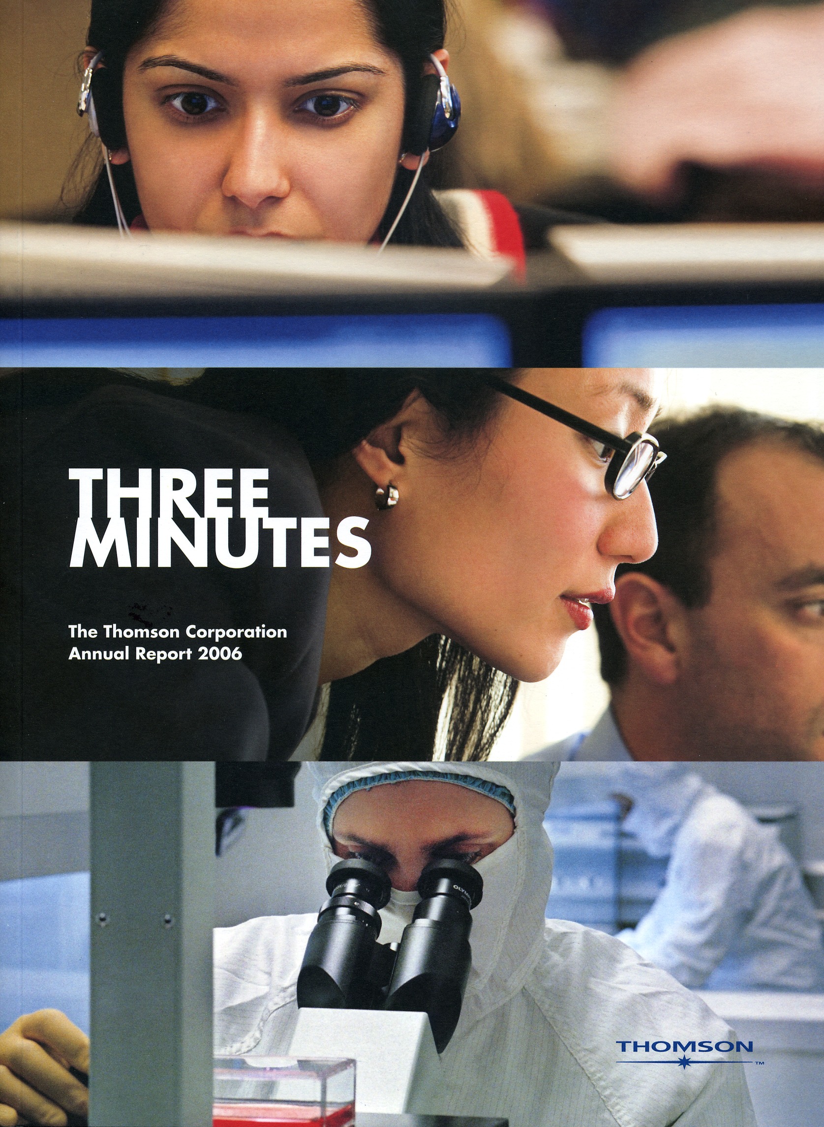 Download This Year's Entry Form Annual Report Highlights: View Competition Class Performance | Company Name: | The Thomson Corporation    | | Company Web Site: | www.thomson.com | | Company Ticker Symbol: | TOC | | Annual Revenue: | $1+ Billion | | Employee Base: | 10,000+ Employees | | Core Industry: | Technology - Software | Approximate Number of Pages: (Narrative/Financial Percent) | 106 (20.8%/79.2%) | | Award Garnered: | Silver | | | | Judging Results | | First Impression: | | | Report Cover: | | | Letter to Shareholders: | | | Report Narrative: | | | Report Financials: | | | Creativity: | | | Message Clarity: | | | Information Accessibility: | | | Total Score: | |