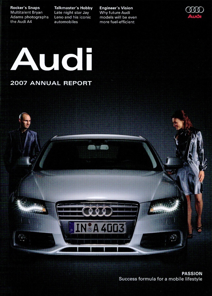 Annual Report Highlights: View Competition Class Performance | Company/Agency Name: | Audi AG    / BurdaYukom Publishing GmbH | | Company/Agency Web Site: | www.audi.de / www.burdayukom.de | | Annual Revenue: | $1+ billion | | Employee Base: | 10,000+ Employees | | Core Industry: | Automobiles & Components | | Award Garnered: | Platinum | | Top 100 Rank: | 60 | | | | Judging Results | | First Impression: | | | Report Cover: | | | Letter to Shareholders: | | | Report Narrative: | | | Report Financials: | | | Creativity: | | | Message Clarity: | | | Information Accessibility: | | | Total Score: | |