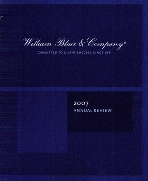 Annual Report Highlights: View Competition Class Performance | Company Name: | William Blair & Company    | | Company Web Site: | www.williamblair.com | | Annual Revenue: | $100 million - $1 billion | | Employee Base: | 100 - 1,000 Employees | | Core Industry: | Financials -- Capital Markets | | Award Garnered: | Silver | | | | Judging Results | | First Impression: | | | Report Cover: | | | Letter to Shareholders: | | | Report Narrative: | | | Report Financials: | | | Creativity: | | | Message Clarity: | | | Information Accessibility: | | | Total Score: | |