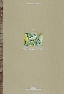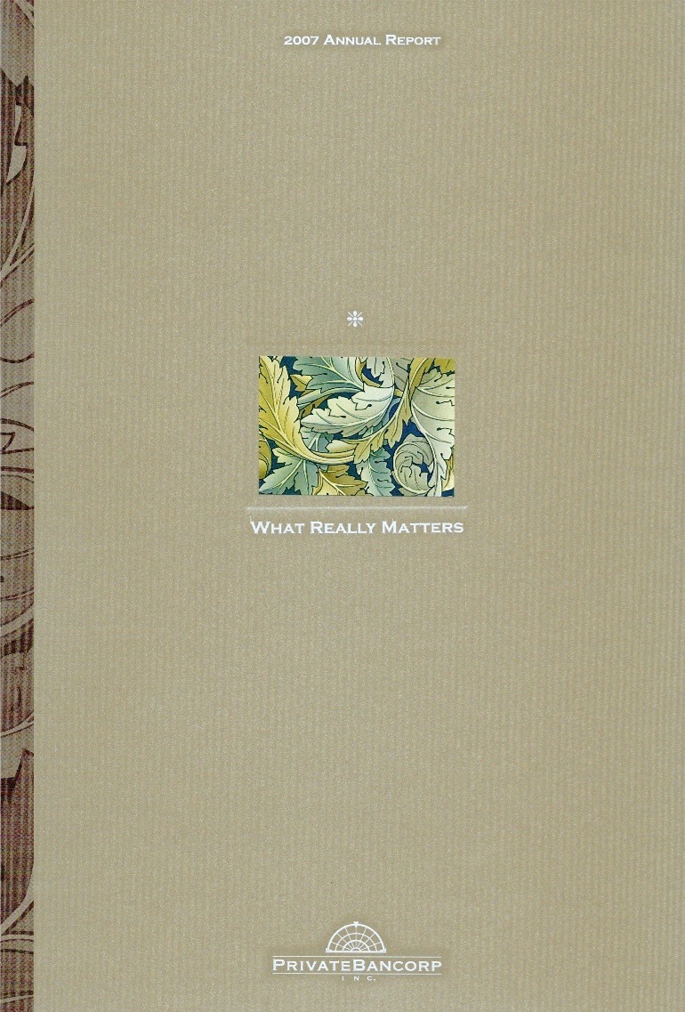 Annual Report Highlights: View Competition Class Performance | Company/Agency Name: | PrivateBancorp    / Meta4 Design | | Company/Agency Web Site: | www.privatebancorp.com / www.meta4design.com | | Annual Revenue: | $10 - $100 million | | Employee Base: | 100 - 1,000 Employees | | Core Industry: | Banks -- Commercial | | Award Garnered: | Gold | | | | Judging Results | | First Impression: | | | Report Cover: | | | Letter to Shareholders: | | | Report Narrative: | | | Report Financials: | | | Creativity: | | | Message Clarity: | | | Information Accessibility: | | | Total Score: | |