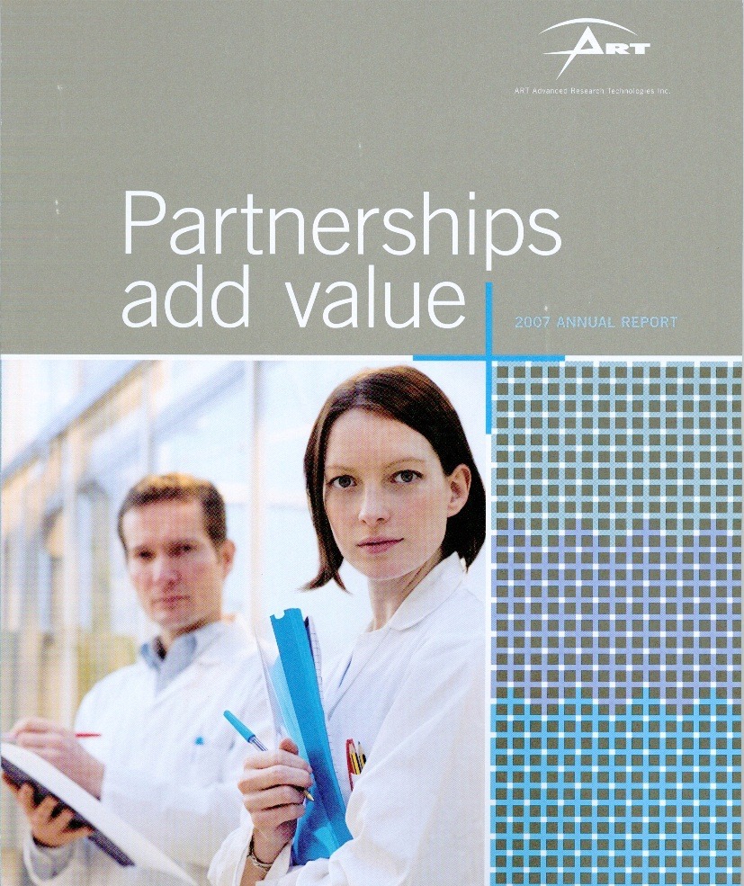 Annual Report Highlights: View Competition Class Performance | Company/Agency Name: | ART Advanced Research Technologies, Inc.    / Ardoise Design et Communications, Inc. | | Company/Agency Web Site: | www.art.ca / www.ardoise.ca | | Company Ticker Symbol: | ART | | Annual Revenue: | Up to $10 million | | Employee Base: | Up to 100 Employees | | Core Industry: | Biotechnology | | Award Garnered: | Bronze | | | | Judging Results | | First Impression: | | | Report Cover: | | | Letter to Shareholders: | | | Report Narrative: | | | Report Financials: | | | Creativity: | | | Message Clarity: | | | Information Accessibility: | | | Total Score: | |