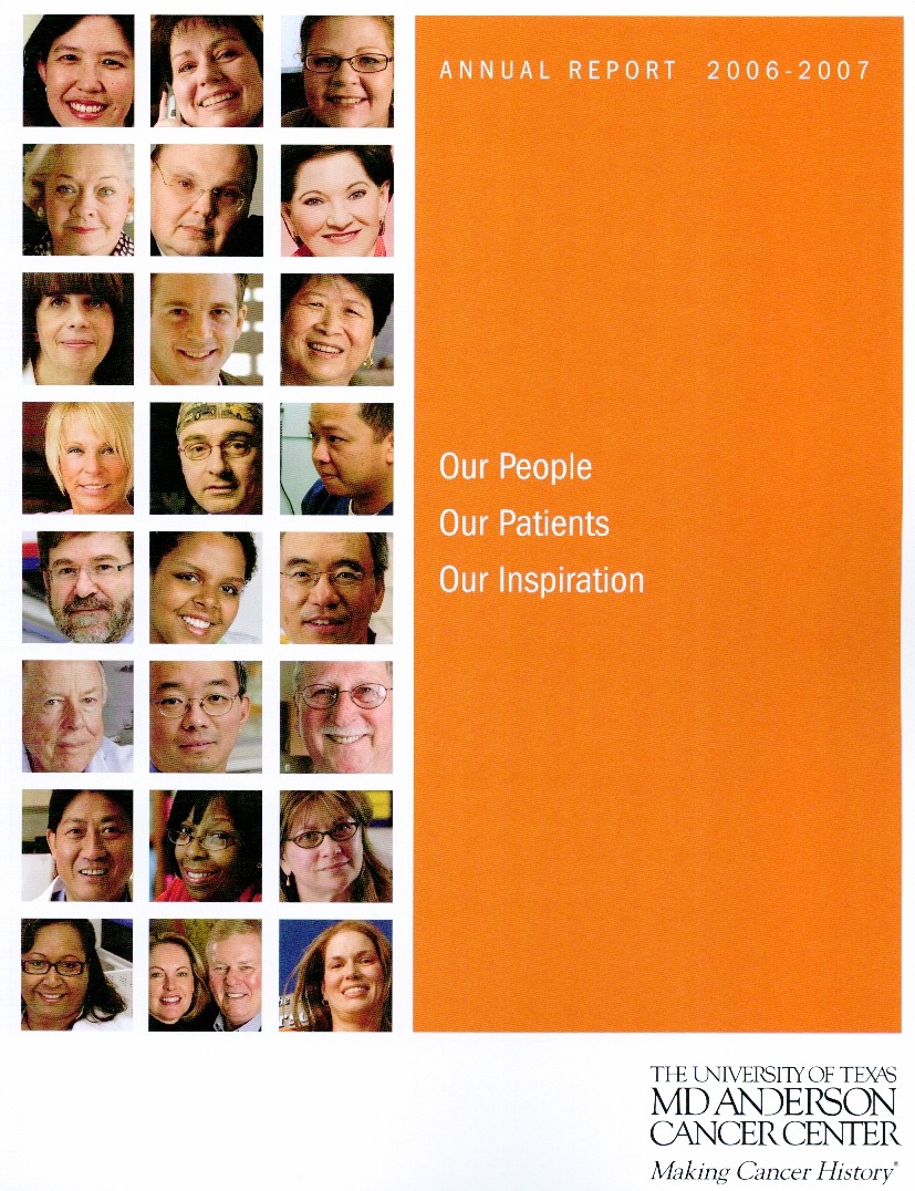 Annual Report Highlights: View Competition Class Performance | Company Name: | M.D. Anderson Cancer Center    | | Company Web Site: | www.mdanderson.com | | Annual Revenue: | $1+ billion | | Employee Base: | 10,000+ Employees | | Core Industry: | Non-Profits | | Award Garnered: | Platinum | | | | Judging Results | | First Impression: | | | Report Cover: | | | Letter to Shareholders: | | | Report Narrative: | | | Report Financials: | | | Creativity: | | | Message Clarity: | | | Information Accessibility: | | | Total Score: | |