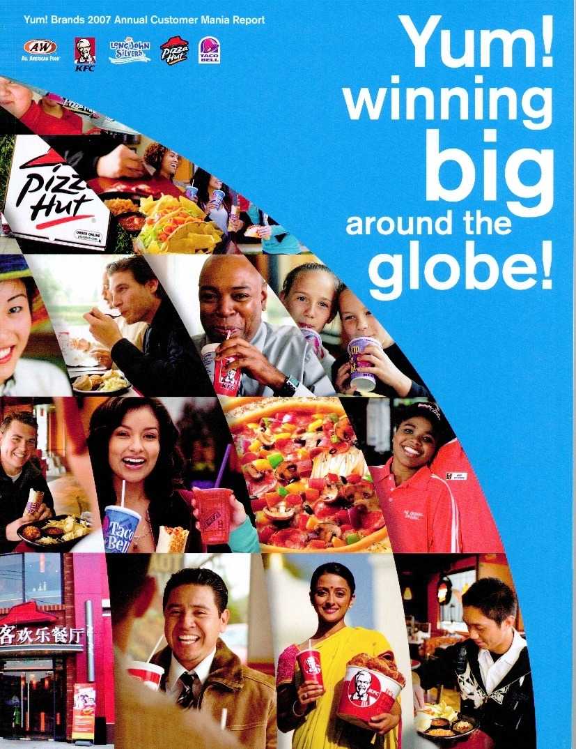 Annual Report Highlights: View Competition Class Performance | Company/Agency Name: | Yum! Brands, Inc.    / Sequel Studio | | Company Web Site: | www.yum.com | | Company Ticker Symbol: | YUM | | Annual Revenue: | $1+ billion | | Employee Base: | 10,000+ Employees | | Core Industry: | Consumer Services -- Restaurants | | Award Garnered: | Gold | | | | Judging Results | | First Impression: | | | Report Cover: | | | Letter to Shareholders: | | | Report Narrative: | | | Report Financials: | | | Creativity: | | | Message Clarity: | | | Information Accessibility: | | | Total Score: | |
