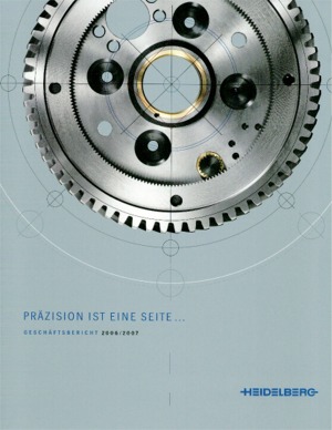 Annual Report Highlights: View Competition Class Performance | Company/Agency Name: | Heidelberger Druckmaschinen    / Hilger & Boie GmbH | | Company/Agency Web Site: | www.heidelberg.com / www.hilger-boie.de | | Company Ticker Symbol: | HDD | | Annual Revenue: | $1+ billion | | Employee Base: | 10,000+ Employees | | Core Industry: | Equipment, Machinery & Instruments | | Award Garnered: | Platinum | | Top 100 Rank: | 2 | | | | Judging Results | | First Impression: | | | Report Cover: | | | Letter to Shareholders: | | | Report Narrative: | | | Report Financials: | | | Creativity: | | | Message Clarity: | | | Information Accessibility: | | | Total Score: | |