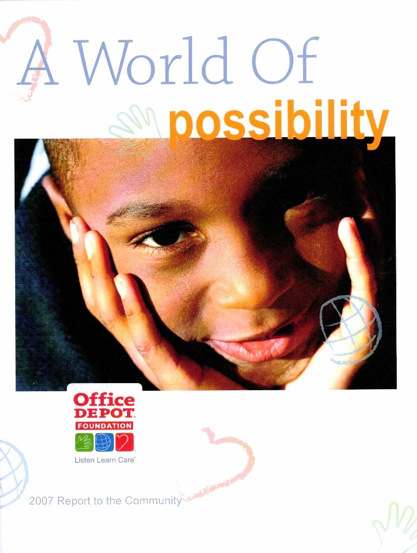 Annual Report Highlights: View Competition Class Performance | Company/Agency Name: | Office Depot Foundation    / JKG Group | | Company/Agency Web Site: | www.officedepotfoundation.org / www.jkggroup.com | | Company Ticker Symbol: | ODP | | Annual Revenue: | $1+ billion | | Employee Base: | 10,000+ Employees | | Core Industry: | Non-Profits | | Award Garnered: | Bronze | | | | Judging Results | | First Impression: | | | Report Cover: | | | Letter to Shareholders: | | | Report Narrative: | | | Report Financials: | | | Creativity: | | | Message Clarity: | | | Information Accessibility: | | | Total Score: | |