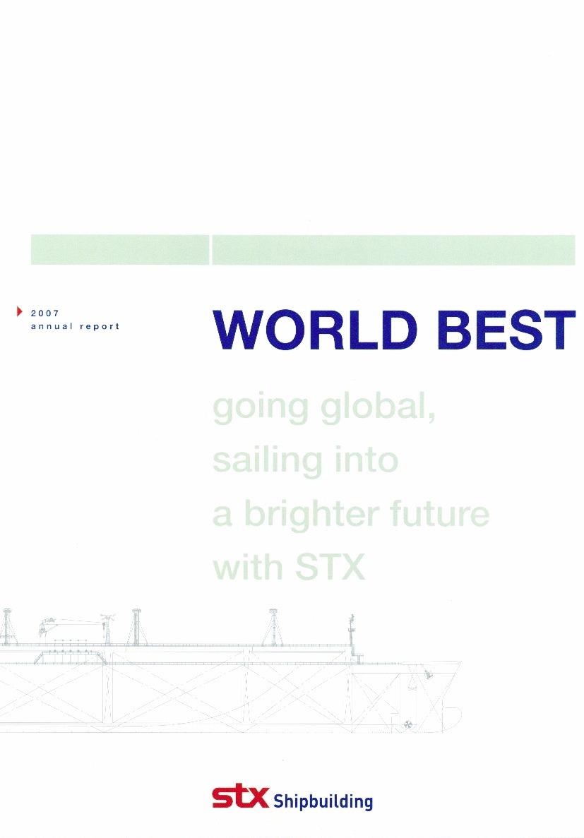 Annual Report Highlights: View Competition Class Performance | Company/Agency Name: | STX Shipbuilding    / PAOS, Inc. | | Company/Agency Web Site: | www.stxship.co.kr / www.paos.co.kr | | Annual Revenue: | $1+ billion | | Employee Base: | 1,000 - 10,000 Employees | | Core Industry: | Business, Construction & Engineering Services | | Award Garnered: | Bronze | | | | Judging Results | | First Impression: | | | Report Cover: | | | Letter to Shareholders: | | | Report Narrative: | | | Report Financials: | | | Creativity: | | | Message Clarity: | | | Information Accessibility: | | | Total Score: | |