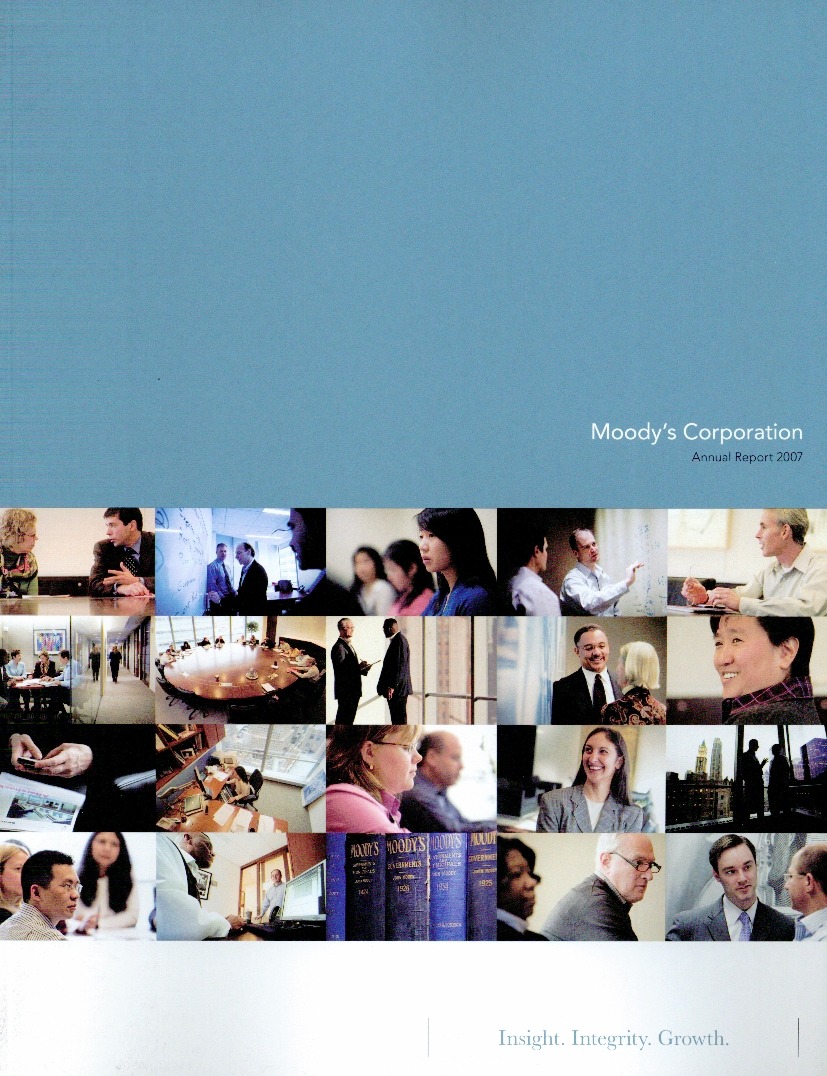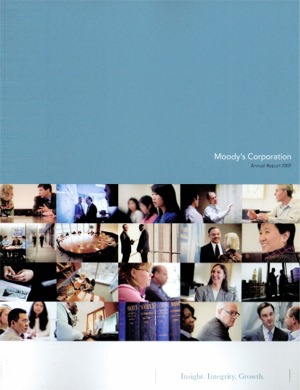 Annual Report Highlights: View Competition Class Performance | Company/Agency Name: | Moody's    / Ideas on Purpose | | Company/Agency Web Site: | www.moodys.com / www.ideasonpurpose.com | | Company Ticker Symbol: | MCO | | Annual Revenue: | $100 million - $1 billion | | Employee Base: | 1,000 - 10,000 Employees | | Core Industry: | Financials -- Capital Markets | | Award Garnered: | Platinum | | | | Judging Results | | First Impression: | | | Report Cover: | | | Letter to Shareholders: | | | Report Narrative: | | | Report Financials: | | | Creativity: | | | Message Clarity: | | | Information Accessibility: | | | Total Score: | |