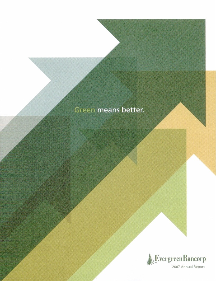 Annual Report Highlights: View Competition Class Performance | Company/Agency Name: | Evergreen Bancorp    / Graphica | | Company/Agency Web Site: | www.evergreenbancorp.com / www.graphicasolutions.com | | Company Ticker Symbol: | EVGG | | Annual Revenue: | $10 - $100 million | | Employee Base: | 100 - 1,000 Employees | | Core Industry: | Banks -- Commercial | | Award Garnered: | Bronze | | | | Judging Results | | First Impression: | | | Report Cover: | | | Letter to Shareholders: | | | Report Narrative: | | | Report Financials: | | | Creativity: | | | Message Clarity: | | | Information Accessibility: | | | Total Score: | |