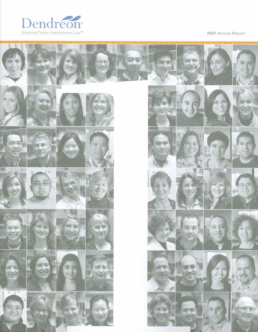 Annual Report Highlights: View Competition Class Performance | Company/Agency Name: | Dendreon    / Graphica | | Company/Agency Web Site: | www.dendreon.com / www.graphicasolutions.com | | Company Ticker Symbol: | DNDN | | Annual Revenue: | Up to $10 million | | Employee Base: | 100 - 1,000 Employees | | Core Industry: | Biotechnology | | Award Garnered: | Honors | | | | Judging Results | | First Impression: | | | Report Cover: | | | Letter to Shareholders: | | | Report Narrative: | | | Report Financials: | | | Creativity: | | | Message Clarity: | | | Information Accessibility: | | | Total Score: | |