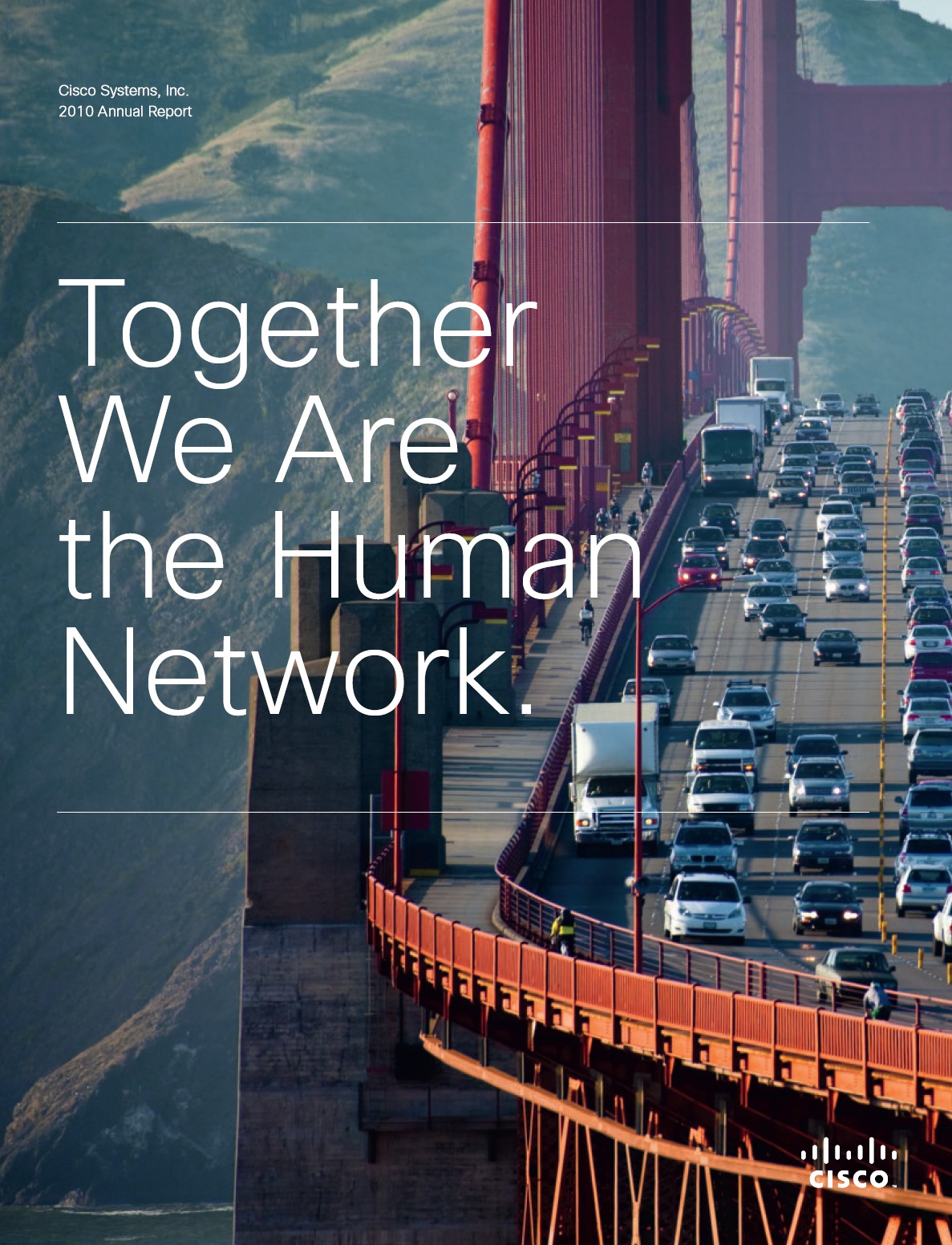 | Company Name: | Cisco Systems  | | Company Web Site: | www.cisco.com | | Company Ticker Symbol: | CSCO | | Annual Revenue: | $10+ billion | | Employee Base: | 10,000+ Employees | | Core Industry: | Technology -- Computers & Peripherals | | Type of Report: | Annual Report | | Title/Theme: | "Together We Are the Human Network" | | Award Garnered: | Platinum | | Top 50 Rank: | 9 | | | | Judging Results | | First Impression: | | | Report Cover: | | | Letter to Shareholders: | | | Report Narrative: | | | Report Financials: | | | Creativity: | | | Message Clarity: | | | Information Accessibility: | | | Total Score: | |