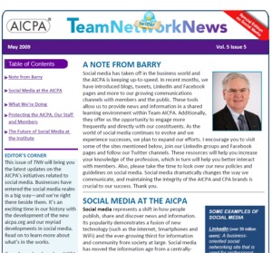Entry Highlights: View Competition Class Performance | Company Name: | AICPA  | | Company Web Site: | www.aicpa.org | | Project Name: | "Team Network News" | | Competition Category: | Web/E-Mail: Newsletter/Magazine/E-Mail-Based Feature | | Annual Revenue: | $10 - $100 million | | Employee Base: | 100 - 1,000 Employees | | Award Garnered: | Bronze | | | | Judging Results | | First Impression: | | | Overall Narrative: | | | Overall Visual Design: | | | Creativity: | | | Message Clarity: | | | Perceived Relevance: | | | Total Score: | |