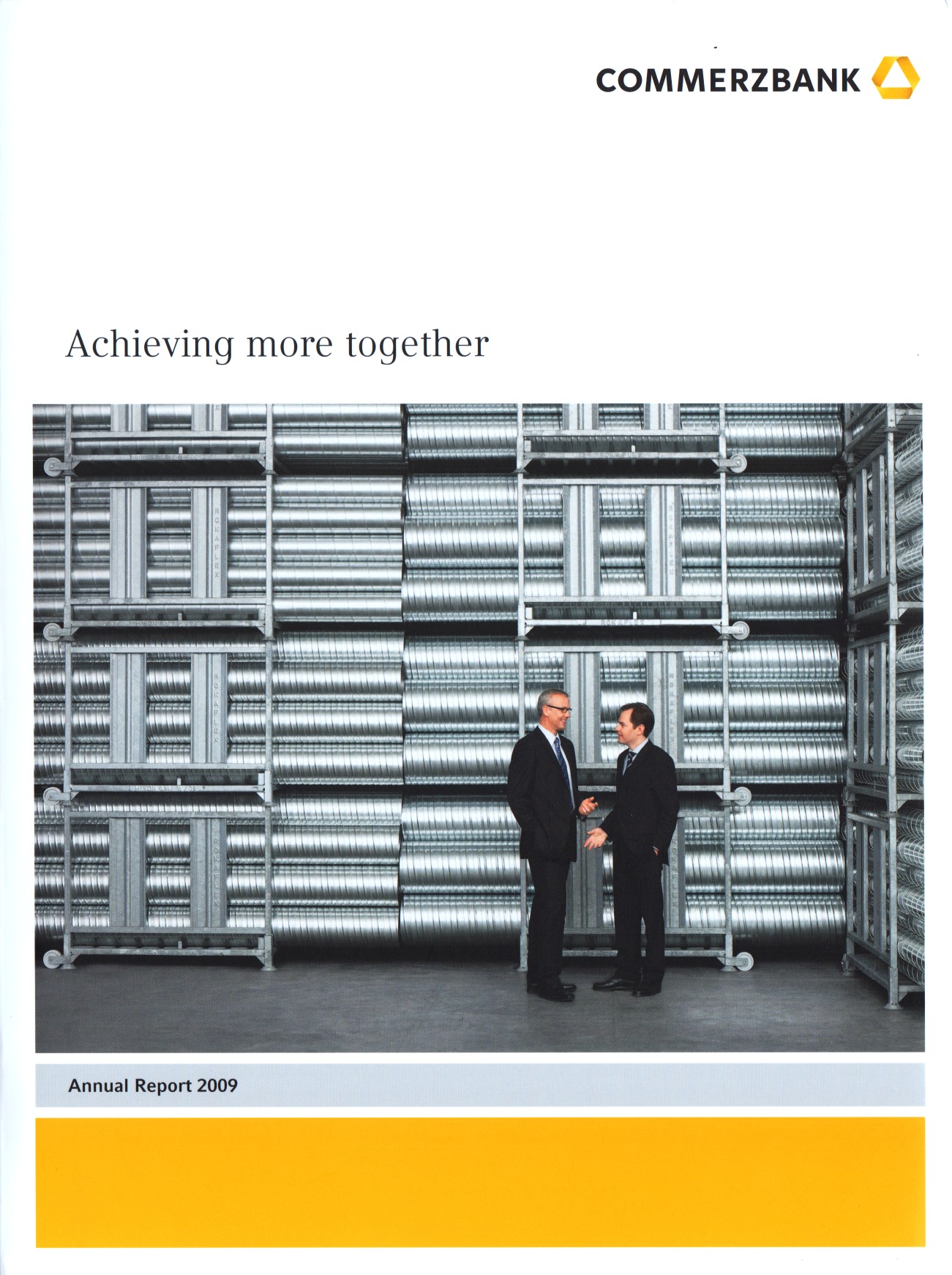| Company/Agency Name: | Commerzbank AG  / wirDesign communications AG | | Company/Agency Web Site: | www.commerzbank.com / www.wirDesign.de | | Company Ticker Symbol: | CBK | | Annual Revenue: | $10+ billion | | Employee Base: | 10,000+ Employees | | Core Industry: | Banks — Commercial | | Type of Report: | Bundled (Multiple Reports Presented Jointly) | | Title/Theme: | "Achieving more together" | | Award Garnered: | Platinum | | Top 100 Rank: | 7 | | | | Judging Results | | First Impression: | | | Report Cover: | | | Letter to Shareholders: | | | Report Narrative: | | | Report Financials: | | | Creativity: | | | Message Clarity: | | | Information Accessibility: | | | Total Score: | |