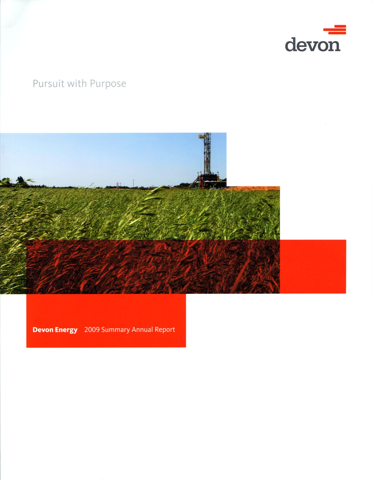 | Company Name: | Devon Energy  | | Company Web Site: | www.devonenergy.com | | Annual Revenue: | $1 - $10 billion | | Employee Base: | 1,000 - 10,000 Employees | | Core Industry: | Energy — Oil, Gas & Consumable Fuels | | Type of Report: | Summary Annual Report | | Title/Theme: | "Pursuit with Purpose" | | Award Garnered: | Bronze | | | | Judging Results | | First Impression: | | | Report Cover: | | | Letter to Shareholders: | | | Report Narrative: | | | Report Financials: | | | Creativity: | | | Message Clarity: | | | Information Accessibility: | | | Total Score: | |