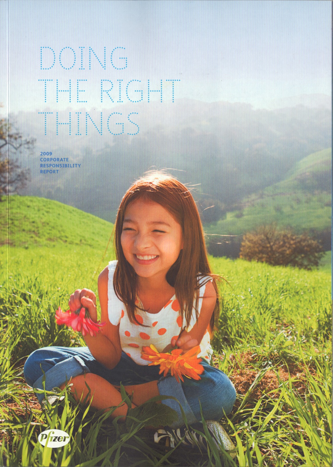 | Company/Agency Name: | Pfizer  / Ideas On Purpose | | Company/Agency Web Site: | www.pfizer.com / www.ideasonpurpose.com | | Annual Revenue: | $10+ billion | | Employee Base: | 10,000+ Employees | | Core Industry: | Pharmaceuticals | | Type of Report: | Corporate Responsibility Report | | Title/Theme: | "Doing the Right Things: Pfizer 2009 Corporate Responsibility Report" | | Award Garnered: | Gold | | | | Judging Results | | First Impression: | | | Report Cover: | | | Letter to Shareholders: | | | Report Narrative: | | | Report Financials: | | | Creativity: | | | Message Clarity: | | | Information Accessibility: | | | Total Score: | |