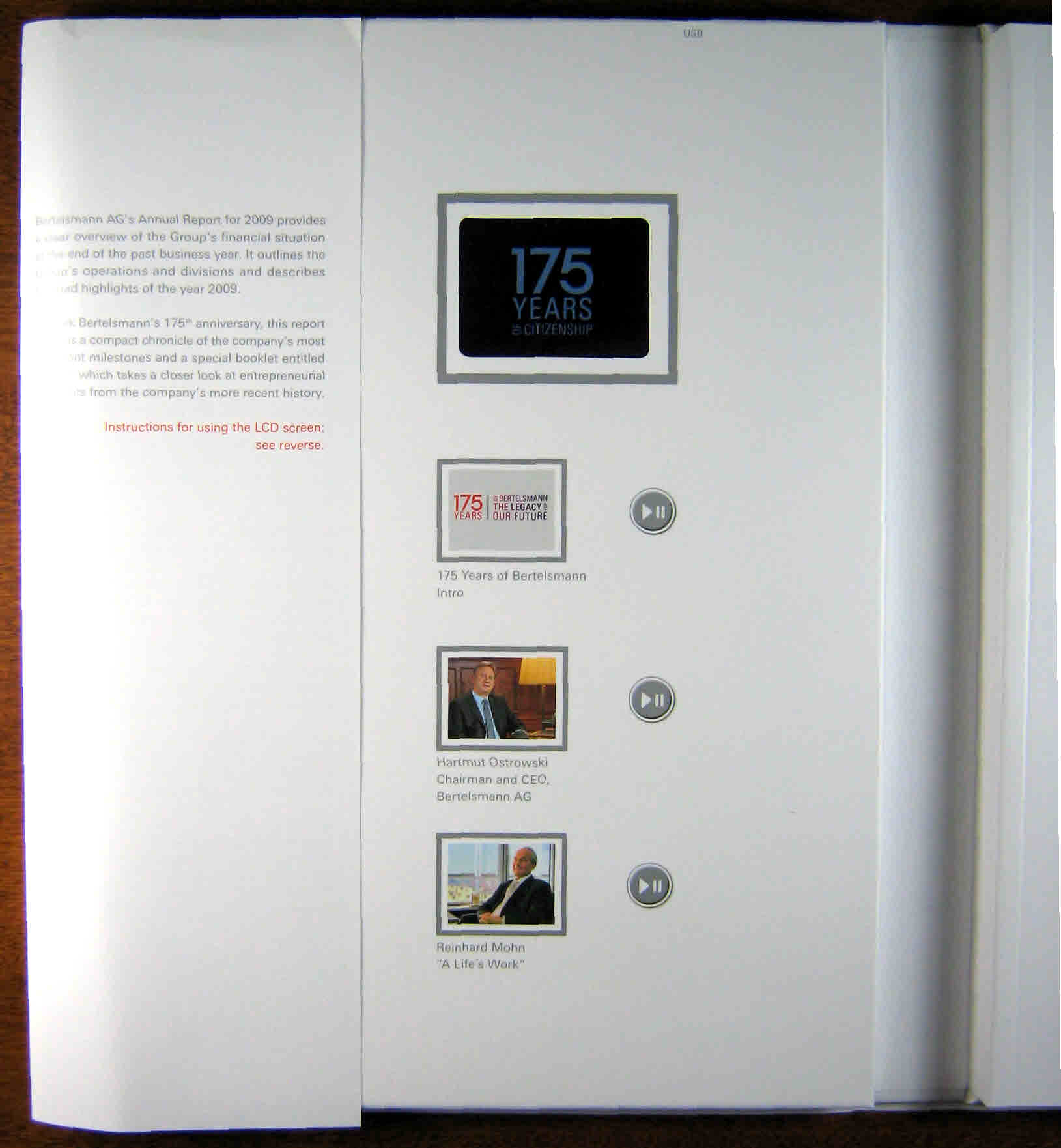 Best Practices in Annual Report Design & Communications As Updated & Compiled from Award-Winning Annual Reports of LACP's 2009 Vision Awards Competition | NEW FEATURE: EMBEDDED VIDEO |  | | | | | | | Clearly, the most exciting feature to debut this year is embedded video. Both Bertelsmann and Gauselmann showcased this capability within their respective front covers with three videos available on demand. | | | | | | | |  | |