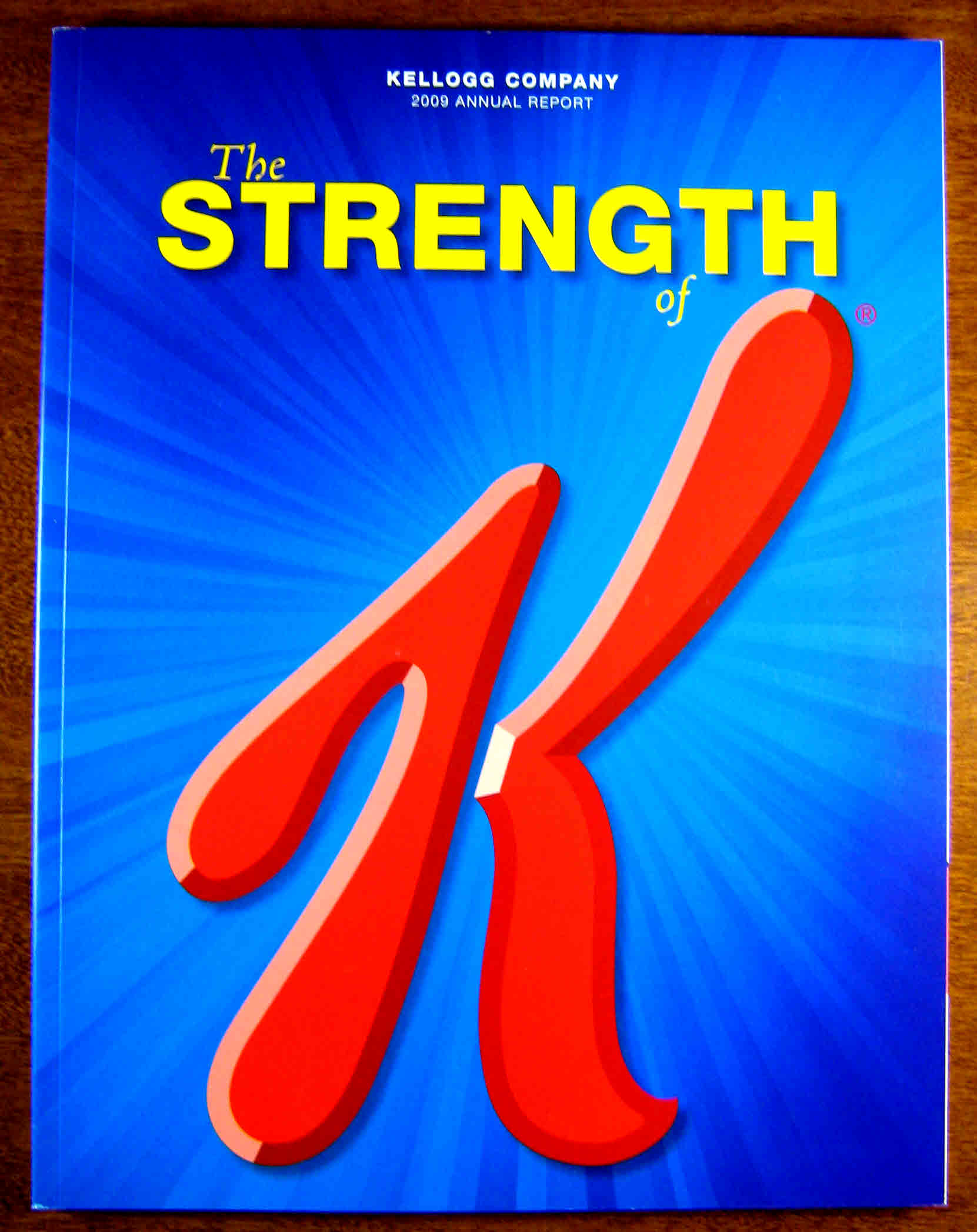 Best Practices in Annual Report Design & Communications As Updated & Compiled from Award-Winning Annual Reports of LACP's 2009 Vision Awards Competition | BRAND IDENTITY |  | | | | | | | Once again, without fishing for a company name, can you identify this annual report simply based on the cover's artwork? It's from Kellogg. From this fragment of the corporate logo, most folks worldwide will know. | | | | | | | |  | |