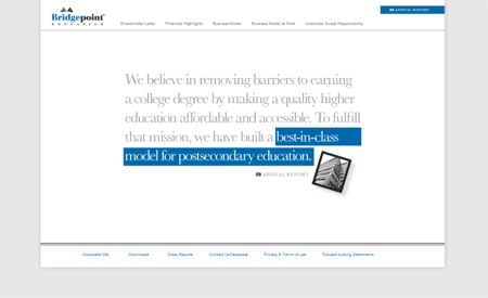 | Company/Agency Name: | Bridgepoint Education  / liquid annual reports, a mentus company | | Company/Agency Web Site: | www.bridgpointeducation.com / www.liquidannual reports.com | | Company Ticker Symbol: | BPI | | Annual Revenue: | $100 million - $1 billion | | Employee Base: | 100 - 1,000 Employees | | Core Industry: | Educational | | Type of Report: | Annual Report | | Award Garnered: | Bronze | | | | Judging Results | | First Impression: | | | Report Cover: | | | Letter to Shareholders: | | | Report Narrative: | | | Report Financials: | | | Creativity: | | | Message Clarity: | | | Information Accessibility: | | | Total Score: | |