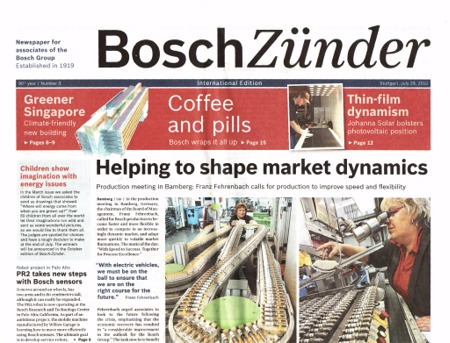 Entry Highlights: View Competition Class Performance | Company/Agency Name: | Robert Bosch GmbH  / KircherBurkhardt GmbH | | Company/Agency Web Site: | www.bosch.de / www.kircher-burkhardt.com | | Project Name: | "Bosch-Zünder" | | Competition Category: | Print: Other (Newspaper) | | Annual Revenue: | $100 million - $1 billion | | Employee Base: | 10,000+ Employees | | Award Garnered: | Gold | | Top 50 Rank: | 8 | | | | Judging Results | | First Impression: | | | Overall Narrative: | | | Overall Visual Design: | | | Creativity: | | | Message Clarity: | | | Perceived Relevance: | | | Total Score: | |