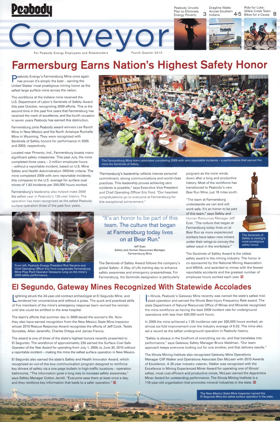 Entry Highlights: View Competition Class Performance | Company Name: | Peabody Energy  | | Company Web Site: | www.peabodyenergy.com | | Project Name: | "Conveyor" Magazine Q4 2010 | | Competition Category: | Print: Magazine/Newsletter | | Annual Revenue: | $1+ billion | | Employee Base: | 1,000 - 10,000 Employees | | Award Garnered: | Bronze | | Top 50 Rank: | 42 | | | | Judging Results | | First Impression: | | | Overall Narrative: | | | Overall Visual Design: | | | Creativity: | | | Message Clarity: | | | Perceived Relevance: | | | Total Score: | |
