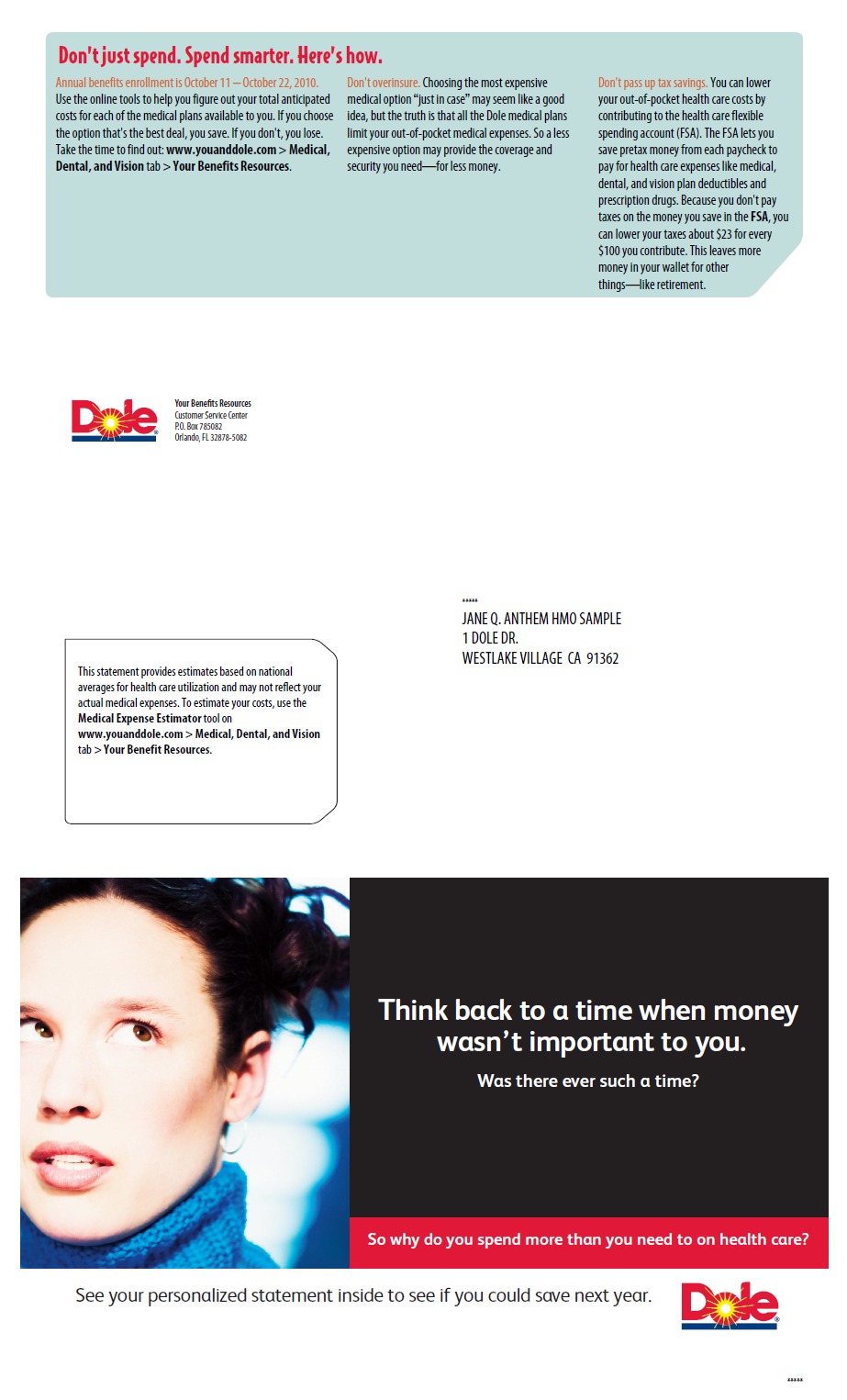 Entry Highlights: View Competition Class Performance | Company/Agency Name: | Dole Food Company, Inc.  / Aon Hewitt | | Company/Agency Web Site: | www.dole.com / www.aonhewitt.com | | Project Name: | The Dole "Spend Smarter" Statement | | Competition Category: | Print: Guide/Toolkit/Report | | Annual Revenue: | $1+ billion | | Employee Base: | 10,000+ Employees | | Award Garnered: | Silver | | Top 50 Rank: | 35 | | | | Judging Results | | First Impression: | | | Overall Narrative: | | | Overall Visual Design: | | | Creativity: | | | Message Clarity: | | | Perceived Relevance: | | | Total Score: | |