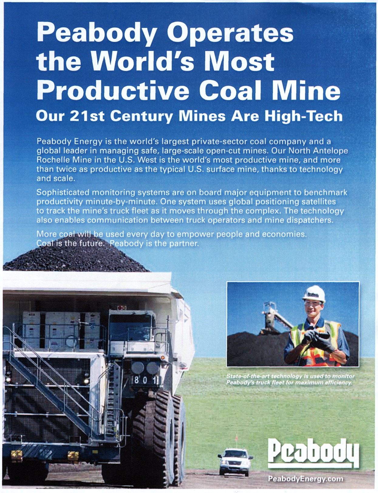 Entry Highlights: View Competition Class Performance | Company Name: | Peabody Energy  | | Company Web Site: | www.peabodyenergy.com | | Project Name: | The Peabody Energy Asia Marketing Ad: "Peabody Operates the World's Most Productive Coal Mine" | | Competition Category: | Print: Other (Advertisement/Ad Series) | | Annual Revenue: | $1+ billion | | Employee Base: | 1,000 - 10,000 Employees | | Award Garnered: | Silver | | Top 50 Rank: | 31 | | | | Judging Results | | First Impression: | | | Overall Narrative: | | | Overall Visual Design: | | | Creativity: | | | Message Clarity: | | | Perceived Relevance: | | | Total Score: | |