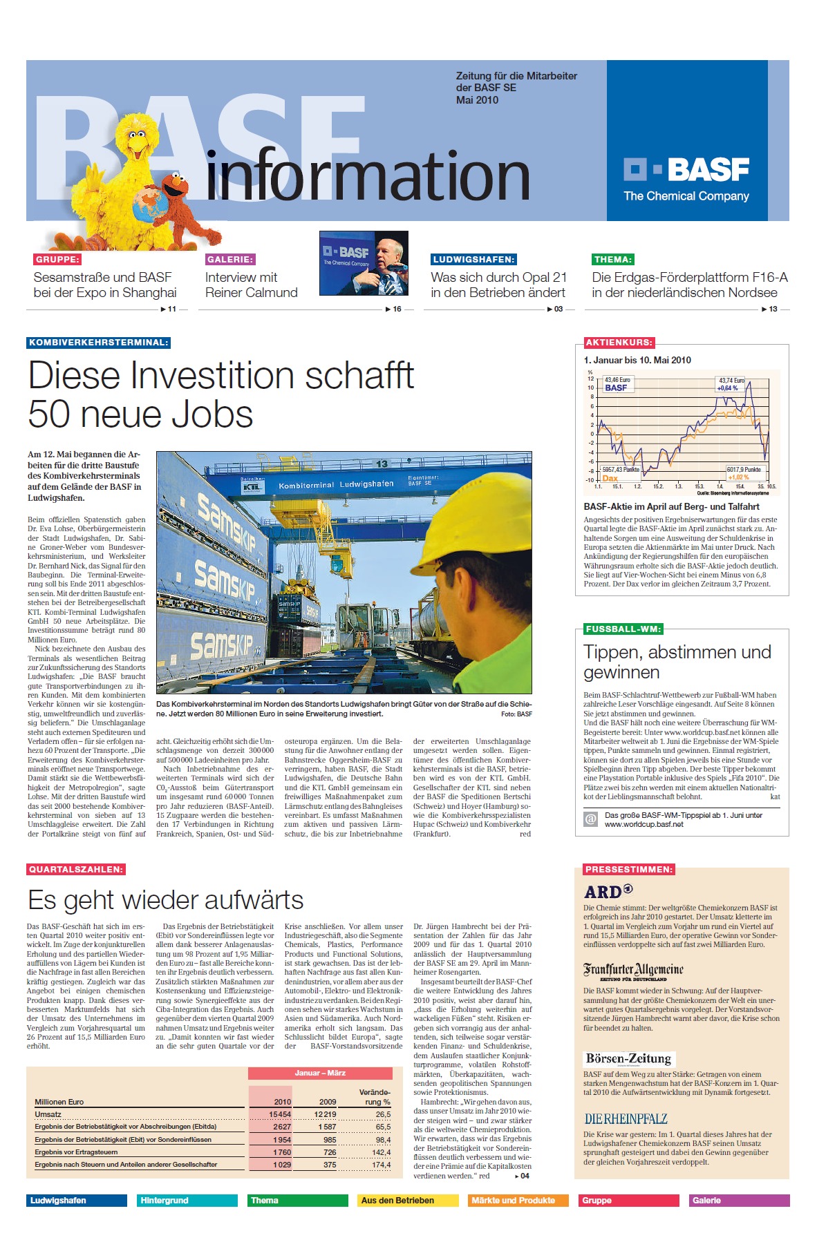 | Company Name: | BASF SE  | | Company Web Site: | www.basf.com | | Company Ticker Symbol: | BFA | | Annual Revenue: | $1+ billion | | Employee Base: | 10,000+ Employees | | Publication/Project Name: | "BASF information" | | Publication Format: | Multiple | Monthly | | Primary Audience: | Employees | | Award Garnered: | Platinum | | Top 50 Rank: | 8 | | | | Judging Results | | First Impression: | | | Artwork: | | | Readability: | | | Creativity: | | | Message Clarity: | | | Variety of Features: | | | Audience Focus: | | | Perceived Relevance: | | | Ease of Navigation: | | | Total Score: | |