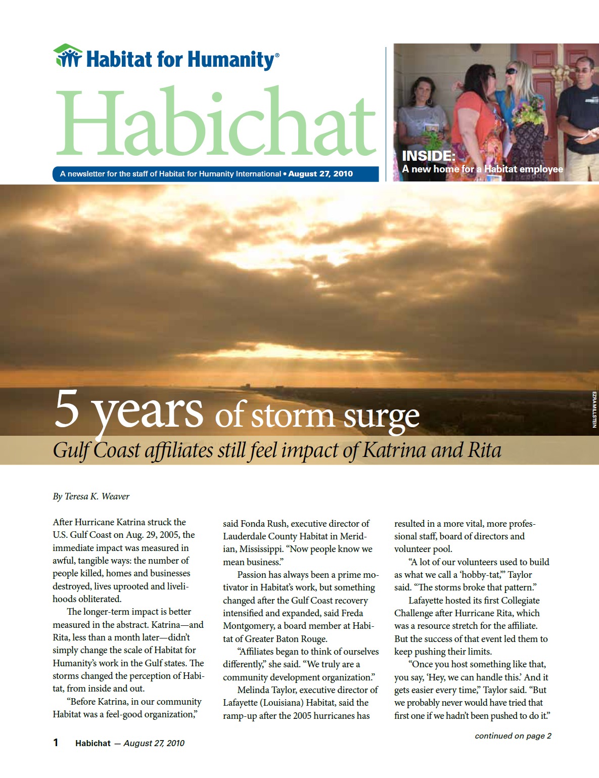 | Company Name: | Habitat for Humanity International  | | Company Web Site: | www.habitat.org | | Annual Revenue: | $100 million - $1 billion | | Employee Base: | 1,000 - 10,000 Employees | | Publication/Project Name: | "Habichat" | | Publication Format: | Print | Weekly | | Primary Audience: | Employees | | Award Garnered: | Gold | | Top 50 Rank: | 26 | | | | Judging Results | | First Impression: | | | Artwork: | | | Readability: | | | Creativity: | | | Message Clarity: | | | Variety of Features: | | | Audience Focus: | | | Perceived Relevance: | | | Ease of Navigation: | | | Total Score: | |