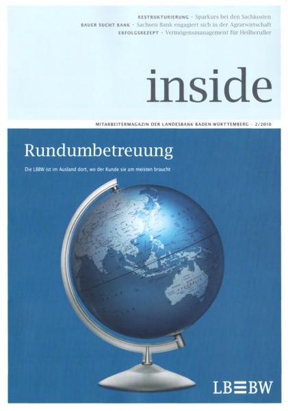 | Company/Agency Name: | Landesbank Baden-Württemberg  / SIGNUM communication Werbeagentur | | Company/Agency Web Site: | www.lbbw.de / www.signum-web.de | | Annual Revenue: | $1+ billion | | Employee Base: | 10,000+ Employees | | Publication/Project Name: | "inside" | | Publication Format: | Print | Quarterly | | Primary Audience: | Employees | | Award Garnered: | Gold | | Top 50 Rank: | 24 | | | | Judging Results | | First Impression: | | | Artwork: | | | Readability: | | | Creativity: | | | Message Clarity: | | | Variety of Features: | | | Audience Focus: | | | Perceived Relevance: | | | Ease of Navigation: | | | Total Score: | |