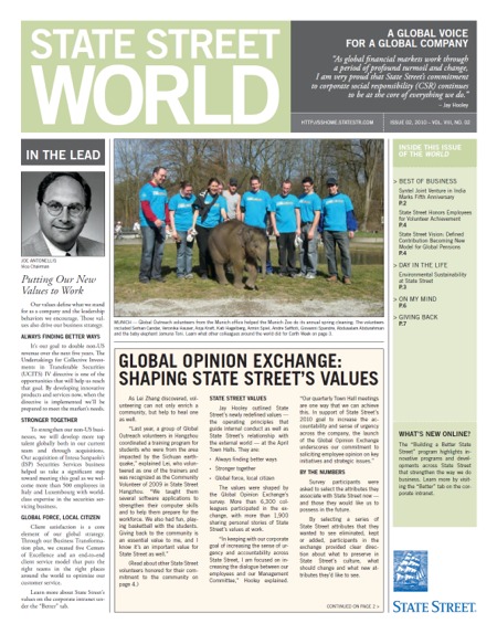 | Company Name: | State Street  | | Company Web Site: | www.statestreet.com | | Company Ticker Symbol: | STT | | Annual Revenue: | $1+ billion | | Employee Base: | 10,000+ Employees | | Publication/Project Name: | "State Street World" | | Publication Format: | Multiple | Quarterly | | Primary Audience: | Employees | | Award Garnered: | Bronze | | Top 50 Rank: | 48 | | | | Judging Results | | First Impression: | | | Artwork: | | | Readability: | | | Creativity: | | | Message Clarity: | | | Variety of Features: | | | Audience Focus: | | | Perceived Relevance: | | | Ease of Navigation: | | | Total Score: | |