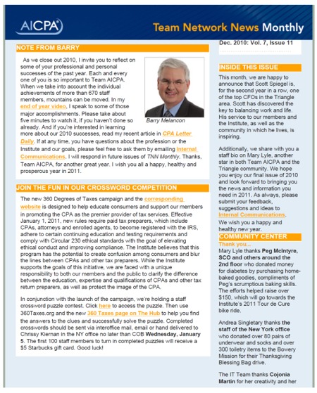 | Company Name: | AICPA  | | Company Web Site: | www.aicpa.org | | Annual Revenue: | Up to $10 million | | Employee Base: | 100 - 1,000 Employees | | Publication/Project Name: | "Team Network News" | | Publication Format: | Web/E-Mail/Electronic | Weekly | | Primary Audience: | Employees | | Award Garnered: | Silver | | | | Judging Results | | First Impression: | | | Artwork: | | | Readability: | | | Creativity: | | | Message Clarity: | | | Variety of Features: | | | Audience Focus: | | | Perceived Relevance: | | | Ease of Navigation: | | | Total Score: | |