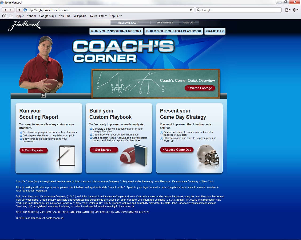 Entry Highlights: View Competition Class Performance | Company Name: | John Hancock Retirement Plan Services  | | Company Web Site: | www.johnhancock.com | | Company Ticker Symbol: | MFC | | Project Name: | "Coach's Corner" | | Competition Category: | Online: Resource-Oriented Web Site | | Annual Revenue: | $1+ billion | | Employee Base: | 10,000+ Employees | | Award Garnered: | Silver | | | | Judging Results | | First Impression: | | | Overall Narrative: | | | Overall Visual Design: | | | Creativity: | | | Message Clarity: | | | Perceived Relevance: | | | Total Score: | |