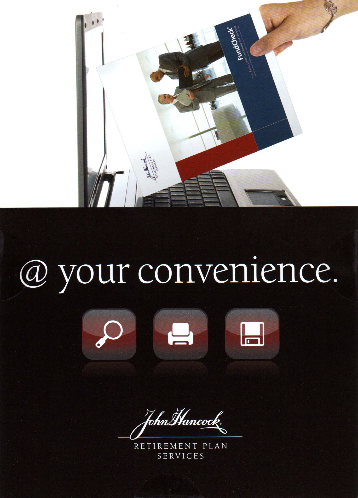 Entry Highlights: View Competition Class Performance | Company Name: | John Hancock Retirement Plan Services  | | Company Web Site: | www.johnhancock.com | | Company Ticker Symbol: | MFC | | Project Name: | FundCheck Online | | Competition Category: | Other: Multi-Format Communications Materials | | Annual Revenue: | $1+ billion | | Employee Base: | 10,000+ Employees | | Award Garnered: | Bronze | | | | Judging Results | | First Impression: | | | Overall Narrative: | | | Overall Visual Design: | | | Creativity: | | | Message Clarity: | | | Perceived Relevance: | | | Total Score: | |