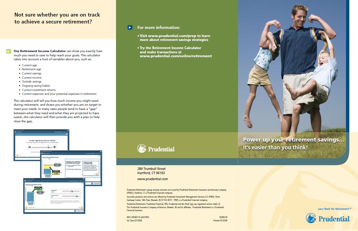 Entry Highlights: View Competition Class Performance | Company Name: | Prudential Retirement  | | Company Web Site: | www.prudential.com | | Project Name: | "Powering Your Retirement Savings" National Webinar | | Competition Category: | Online: Resource-Oriented Web Site | | Annual Revenue: | $1+ billion | | Employee Base: | 10,000+ Employees | | Award Garnered: | Gold | | Top 100 Rank: | 53 | | | | Judging Results | | First Impression: | | | Overall Narrative: | | | Overall Visual Design: | | | Creativity: | | | Message Clarity: | | | Perceived Relevance: | | | Total Score: | |