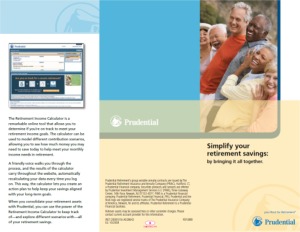 Entry Highlights: View Competition Class Performance | Company Name: | Prudential Retirement  | | Company Web Site: | www.prudential.com | | Project Name: | "Rollover In" | | Competition Category: | Other: Multi-Format Communications Materials | | Annual Revenue: | $1+ billion | | Employee Base: | 10,000+ Employees | | Award Garnered: | Platinum | | Top 100 Rank: | 19 | | | | Judging Results | | First Impression: | | | Overall Narrative: | | | Overall Visual Design: | | | Creativity: | | | Message Clarity: | | | Perceived Relevance: | | | Total Score: | |