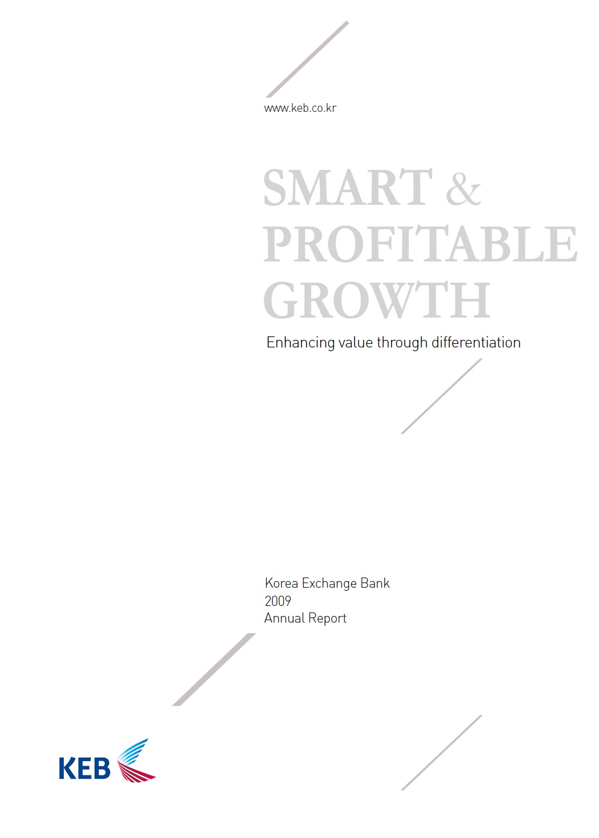 Entry Highlights: View Competition Class Performance | Company/Agency Name: | Korea Exchange Bank  / PAOS | | Company/Agency Web Site: | www.keb.co.kr / www.paos.co.kr | | Project Name: | "Smart & Profitable Growth" | | Competition Category: | Print: Annual Report | | Annual Revenue: | $100 million - $1 billion | | Employee Base: | 1,000 - 10,000 Employees | | Award Garnered: | Bronze | | | | Judging Results | | First Impression: | | | Overall Narrative: | | | Overall Visual Design: | | | Creativity: | | | Message Clarity: | | | Perceived Relevance: | | | Total Score: | |