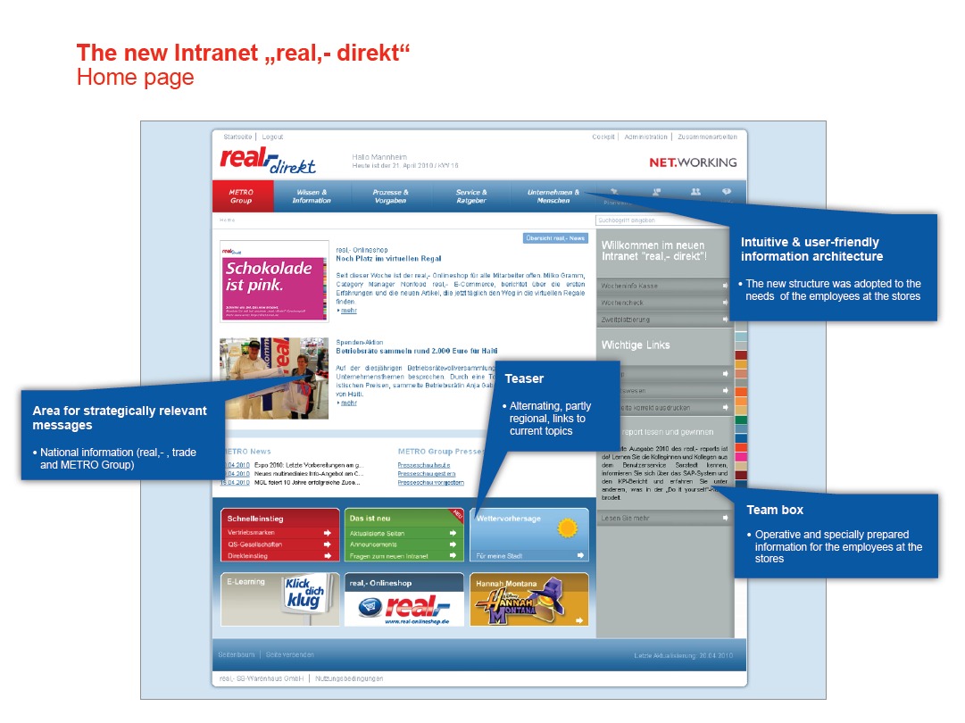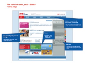 Entry Highlights: View Competition Class Performance | Company/Agency Name: | real,- SB-Warenhaus GmbH  / Kuhn, Kamman & Kuhn | | Company/Agency Web Site: | www.real.de / www.kkk-ag.de | | Project Name: | "Teamboxes" | | Competition Category: | Online: Intranet | | Annual Revenue: | $100 million - $1 billion | | Employee Base: | 10,000+ Employees | | Award Garnered: | Gold | | Top 100 Rank: | 47 | | | | Judging Results | | First Impression: | | | Overall Narrative: | | | Overall Visual Design: | | | Creativity: | | | Message Clarity: | | | Perceived Relevance: | | | Total Score: | |