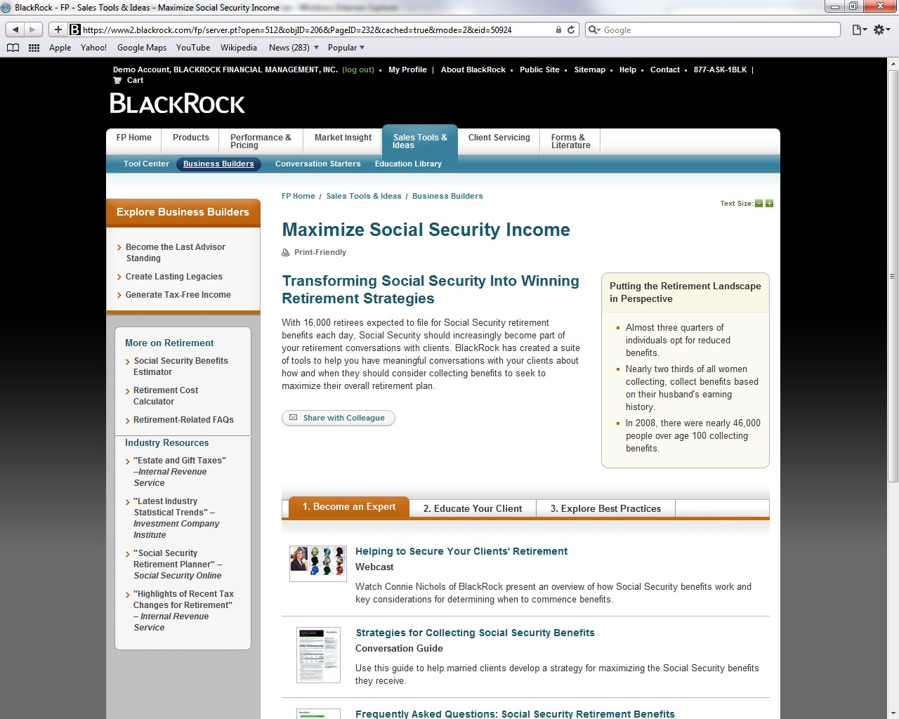 Entry Highlights: View Competition Class Performance | Company Name: | BlackRock, Inc.  | | Company Web Site: | www.blackrock.com | | Project Name: | The BlackRock "Maximize Social Security Income" Microsite | | Competition Category: | Online: Intranet | | Annual Revenue: | $1+ billion | | Employee Base: | 1,000 - 10,000 Employees | | Award Garnered: | Platinum | | Top 100 Rank: | 18 | | | | Judging Results | | First Impression: | | | Overall Narrative: | | | Overall Visual Design: | | | Creativity: | | | Message Clarity: | | | Perceived Relevance: | | | Total Score: | |