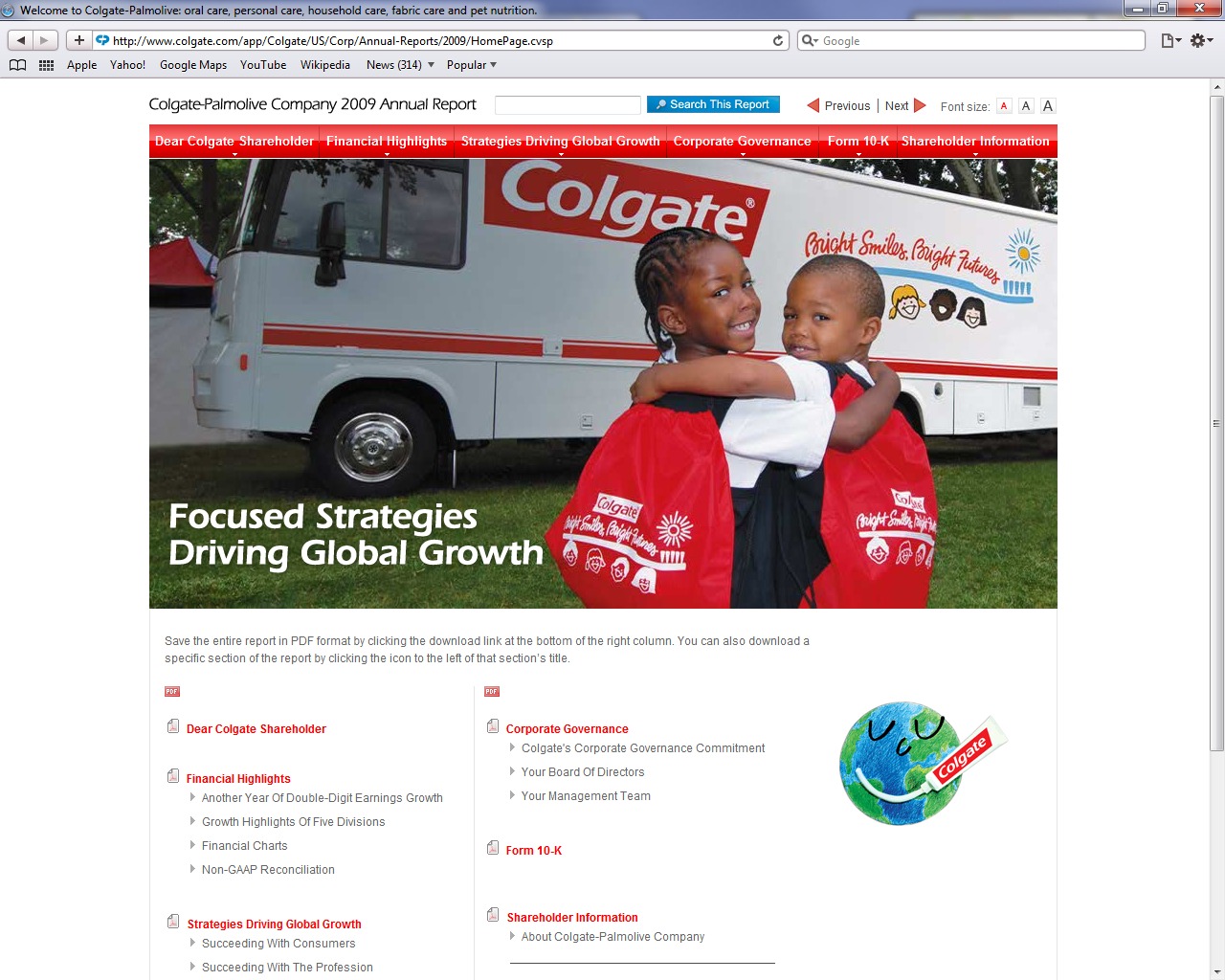 Entry Highlights: View Competition Class Performance | Company Name: | Colgate-Palmolive  | | Company Web Site: | investor.colgate.com | | Company Ticker Symbol: | CL | | Project Name: | The Colgate-Palmolive 2009 Annual Report Online Edition | | Competition Category: | Online: Annual/Sustainability Report | | Annual Revenue: | $1+ billion | | Employee Base: | 10,000+ Employees | | Award Garnered: | Bronze | | | | Judging Results | | First Impression: | | | Overall Narrative: | | | Overall Visual Design: | | | Creativity: | | | Message Clarity: | | | Perceived Relevance: | | | Total Score: | |