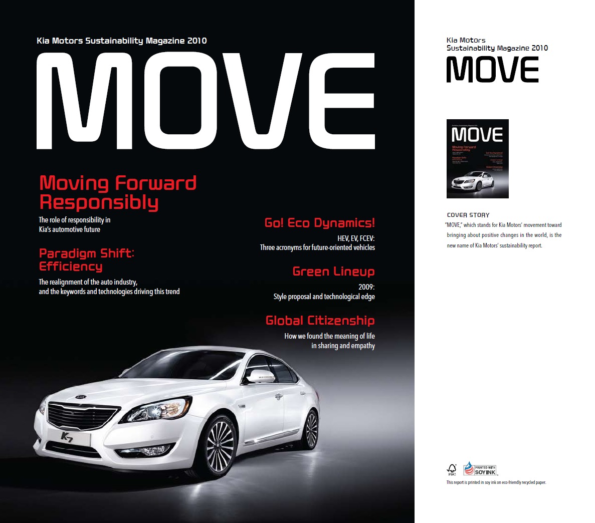 Entry Highlights: View Competition Class Performance | Company/Agency Name: | Kia Motors  / intonation | | Company/Agency Web Site: | www.kiamotors.com / www.intonation.kr | | Project Name: | The Kia Motors Sustainability Report 2010 | | Competition Category: | Print: CSR/Sustainability Report | | Annual Revenue: | $1+ billion | | Employee Base: | 10,000+ Employees | | Award Garnered: | Platinum | | Top 100 Rank: | 15 | | | | Judging Results | | First Impression: | | | Overall Narrative: | | | Overall Visual Design: | | | Creativity: | | | Message Clarity: | | | Perceived Relevance: | | | Total Score: | |