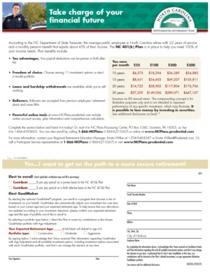 Entry Highlights: View Competition Class Performance | Company/Agency Name: | NC Supplemental Retirement Plans  / Prudential Retirement | | Company/Agency Web Site: | www.myncretirement.com / www.prudential.com | | Project Name: | The North Carolina Supplemental Retirement Plan EZ Take Action Flyer | | Competition Category: | Print: Posters, Flyers and Related Promotional Materials | | Annual Revenue: | $1+ billion | | Employee Base: | 10,000+ Employees | | Award Garnered: | Platinum | | Top 100 Rank: | 17 | | | | Judging Results | | First Impression: | | | Overall Narrative: | | | Overall Visual Design: | | | Creativity: | | | Message Clarity: | | | Perceived Relevance: | | | Total Score: | |