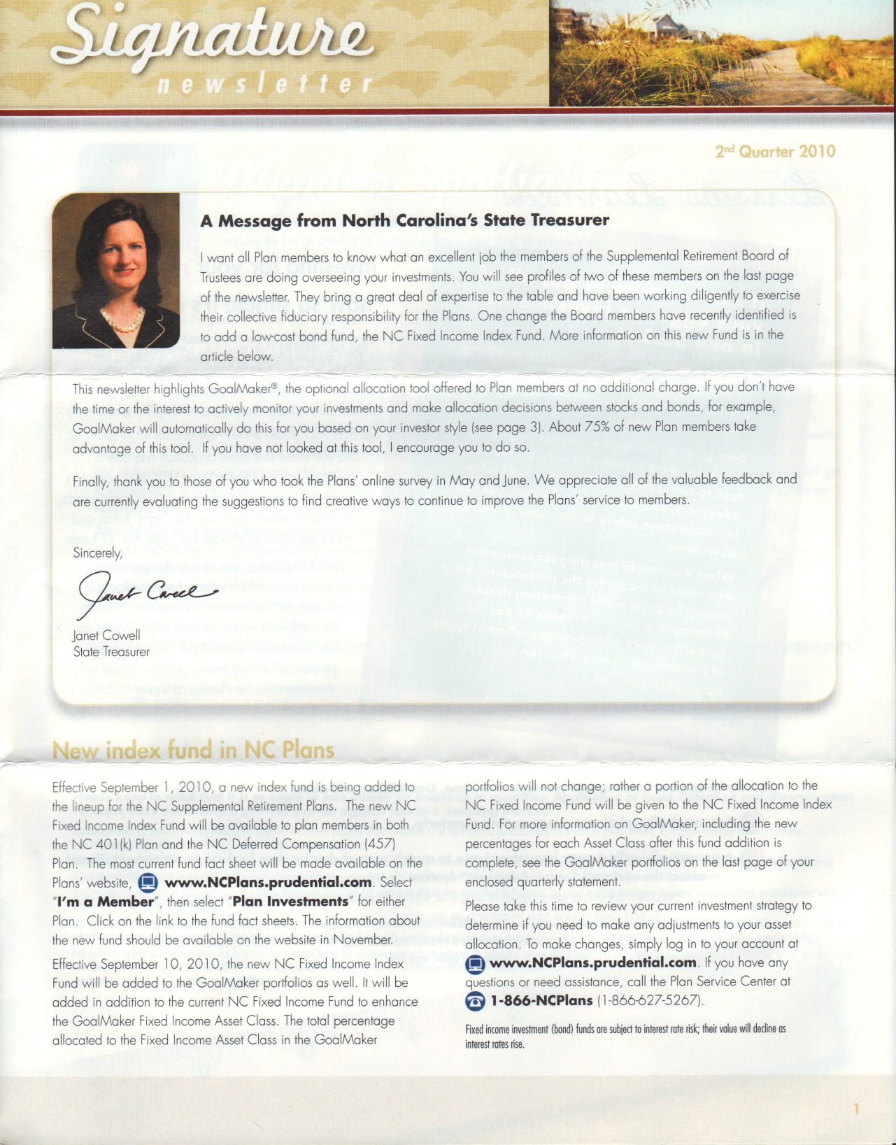 Entry Highlights: View Competition Class Performance | Company/Agency Name: | NC Supplemental Retirement Plans  / Prudential Retirement | | Company/Agency Web Site: | www.myncretirement.com / www.prudential.com | | Project Name: | The North Carolina Supplemental Retirement Plan Signature Newsletter | | Competition Category: | Print: Magazine/Newsletter | | Annual Revenue: | $1+ billion | | Employee Base: | 10,000+ Employees | | Award Garnered: | Gold | | Top 100 Rank: | 42 | | | | Judging Results | | First Impression: | | | Overall Narrative: | | | Overall Visual Design: | | | Creativity: | | | Message Clarity: | | | Perceived Relevance: | | | Total Score: | |