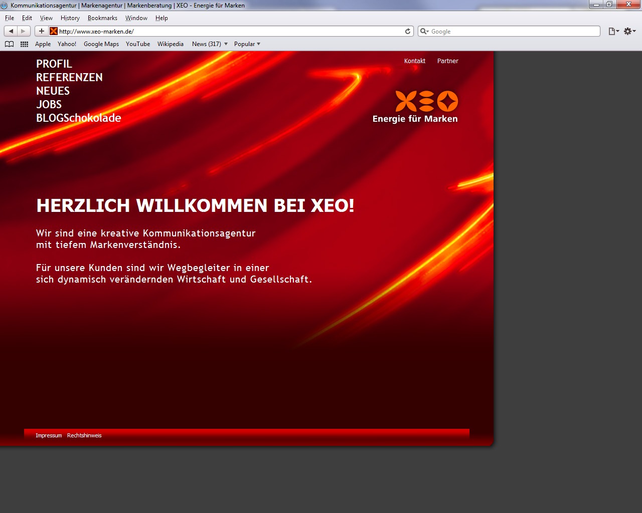 Entry Highlights: View Competition Class Performance | Company Name: | XEO GmbH  | | Company Web Site: | www.xeo-marken.de | | Project Name: | The XEO Corporate Website | | Competition Category: | Online: Organizational Web Site | | Annual Revenue: | Up to $10 million | | Employee Base: | Up to 100 Employees | | Award Garnered: | Silver | | | | Judging Results | | First Impression: | | | Overall Narrative: | | | Overall Visual Design: | | | Creativity: | | | Message Clarity: | | | Perceived Relevance: | | | Total Score: | |