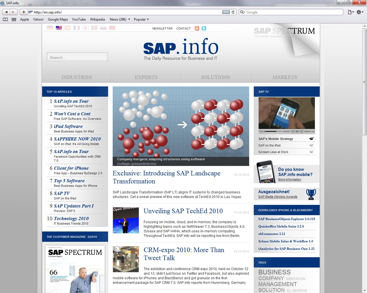 Entry Highlights: View Competition Class Performance | Company/Agency Name: | SAP AG  / grasundsterne | | Company/Agency Web Site: | www.sap.com / www.grasundsterne.de | | Project Name: | SAP.info | | Competition Category: | Online: Intranet | | Annual Revenue: | $1+ billion | | Employee Base: | 10,000+ Employees | | Award Garnered: | Silver | | Top 100 Rank: | 85 | | | | Judging Results | | First Impression: | | | Overall Narrative: | | | Overall Visual Design: | | | Creativity: | | | Message Clarity: | | | Perceived Relevance: | | | Total Score: | |