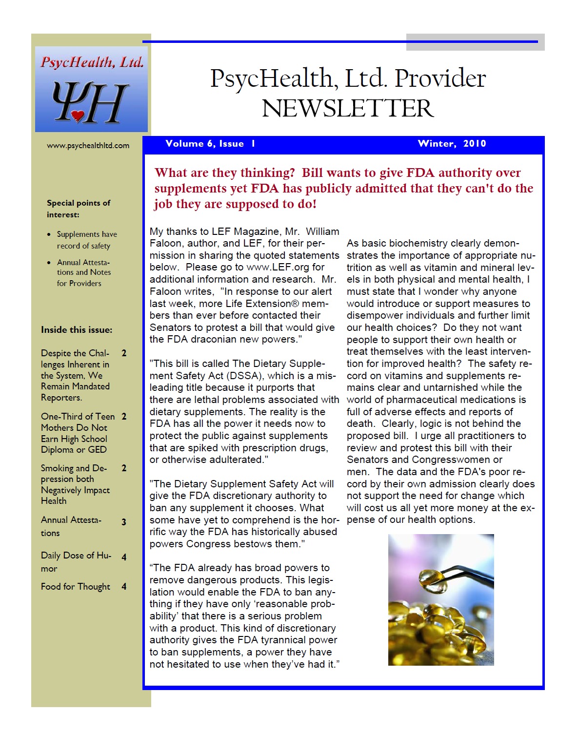 Entry Highlights: View Competition Class Performance | Company Name: | PsycHealth, Ltd.  | | Company Web Site: | www.psychealthltd.com | | Project Name: | The PsycHealth, Ltd. Provider Newsletter | | Competition Category: | Print: Magazine/Newsletter | | Annual Revenue: | Up to $10 million | | Employee Base: | Up to 100 Employees | | Award Garnered: | Bronze | | | | Judging Results | | First Impression: | | | Overall Narrative: | | | Overall Visual Design: | | | Creativity: | | | Message Clarity: | | | Perceived Relevance: | | | Total Score: | |