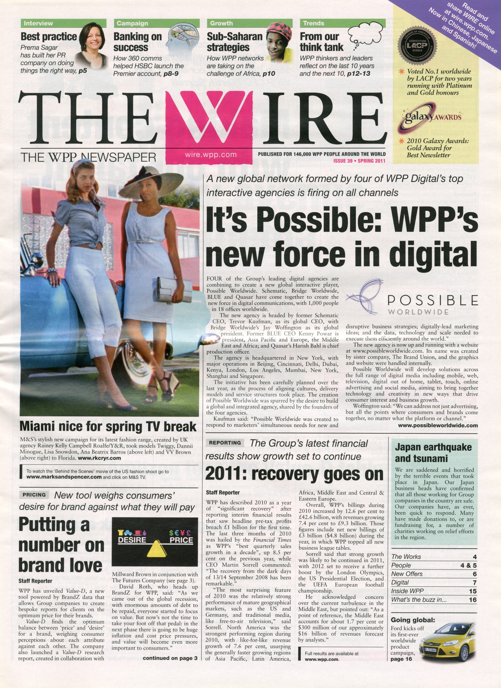 | Company Name: | WPP  | | Company Web Site: | www.wpp.com | | Company Ticker Symbol: | #WPPGY | | Annual Revenue: | $1+ billion | | Employee Base: | 10,000+ Employees | | Publication/Project Name: | "The Wire" | | Publication Format: | Multiple | Quarterly | | Primary Audience: | Employees | | Award Garnered: | Silver | | Top 50 Rank: | 44 | | | | Judging Results | | First Impression: | | | Artwork: | | | Readability: | | | Creativity: | | | Message Clarity: | | | Variety of Features: | | | Audience Focus: | | | Perceived Relevance: | | | Ease of Navigation: | | | Total Score: | |