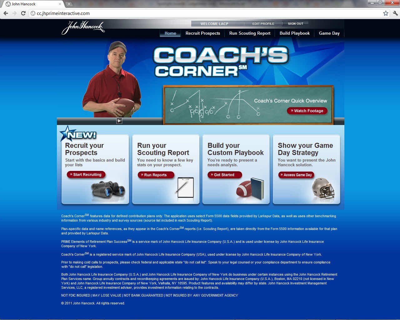 Entry Highlights: View Competition Class Performance | Company Name: | John Hancock Retirement Plan Services  | | Company Web Site: | www.johnhancock.com | | Company Ticker Symbol: | $MFC | | Project Name: | "Coach's Corner 3.0" | | Competition Category: | Web/Digital: Program/Product/Service Site | | Annual Revenue: | $1+ billion | | Employee Base: | 10,000+ Employees | | Award Garnered: | Silver | | | | Judging Results | | First Impression: | | | Overall Narrative: | | | Overall Visual Design: | | | Creativity: | | | Message Clarity: | | | Perceived Relevance: | | | Total Score: | |