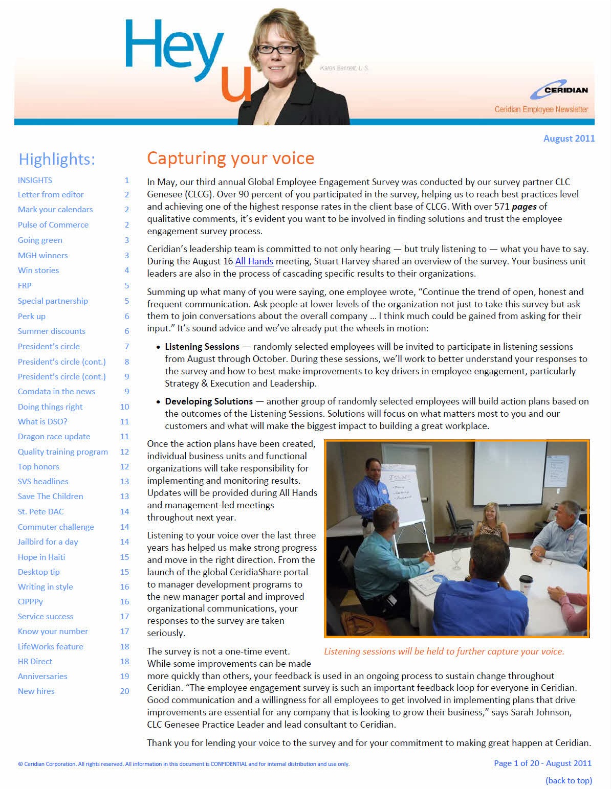 Entry Highlights: View Competition Class Performance | Company Name: | Ceridian  | | Company Web Site: | www.ceridian.com | | Project Name: | The "Hey U!" Employee Newsletter | | Competition Category: | Web/Digital: Newsletter/Magazine | | Annual Revenue: | $1+ billion | | Employee Base: | 1,000 - 10,000 Employees | | Award Garnered: | Platinum | | | | Judging Results | | First Impression: | | | Overall Narrative: | | | Overall Visual Design: | | | Creativity: | | | Message Clarity: | | | Perceived Relevance: | | | Total Score: | |