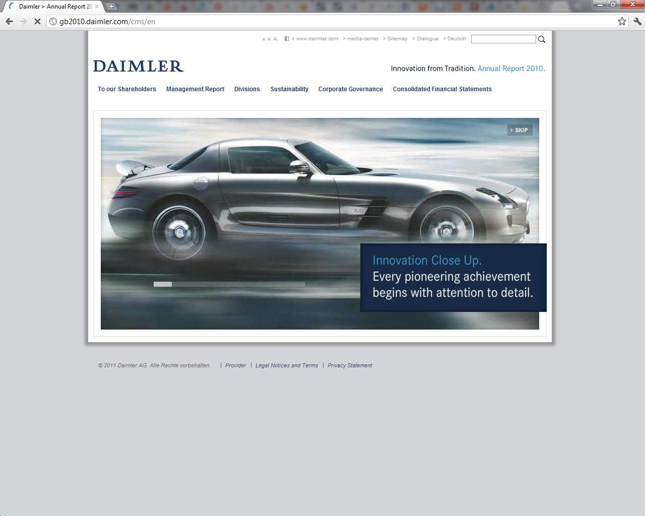 Entry Highlights: View Competition Class Performance | Company/Agency Name: | Daimler AG  / NetFederation GmbH | | Company/Agency Web Site: | gb2010.daimler.com/cms/en / www.net-federation.de | | Company Ticker Symbol: | DAI | | Project Name: | "Innovation Close Up." | | Competition Category: | Web/Digital: Online Report | | Annual Revenue: | $1+ billion | | Employee Base: | 10,000+ Employees | | Award Garnered: | Bronze | | | | Judging Results | | First Impression: | | | Overall Narrative: | | | Overall Visual Design: | | | Creativity: | | | Message Clarity: | | | Perceived Relevance: | | | Total Score: | |