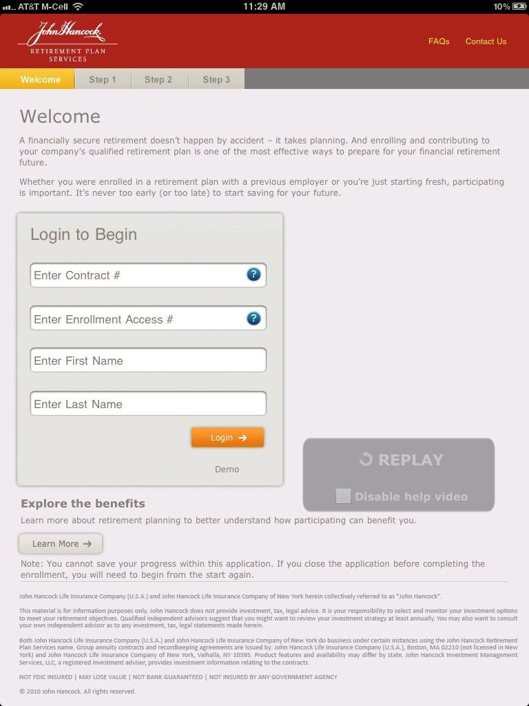 Entry Highlights: View Competition Class Performance | Company Name: | John Hancock Retirement Plan Services  | | Company Web Site: | www.johnhancock.com | | Company Ticker Symbol: | MFC | | Project Name: | The Online Enrollment Experience iPad App | | Competition Category: | Web/Digital: iPad App | | Annual Revenue: | $1+ billion | | Employee Base: | 10,000+ Employees | | Award Garnered: | Gold | | Top 100 Rank: | 81 | | | | Judging Results | | First Impression: | | | Overall Narrative: | | | Overall Visual Design: | | | Creativity: | | | Message Clarity: | | | Perceived Relevance: | | | Total Score: | |